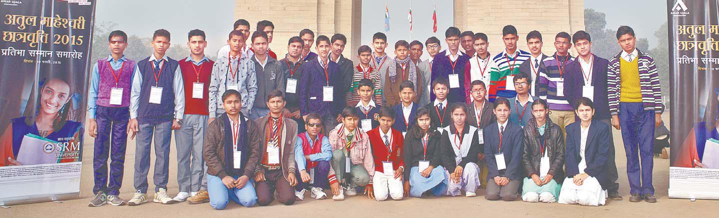 छात्रों को संबोधित करते हुए स्मृति ईरानी ने कहा, ‘आपका लक्ष्य सिर्फ पैसा कमाने का जरिया न बने। आपके लक्ष्य से समाज सेवा और देश की प्रगति में योगदान होना चाहिए।’ इस मौके पर प्रधानमंत्री नरेंद्र मोदी ने भी बच्चों को अपना शुभकामना संदेश भेजा। प्रधानमंत्री ने समाज के कमजोर तबके के मेधावी छात्रों को अमर उजाला फाउंडेश्ान की ओर से छात्रवृत्ति देने की इस पहल की तारीफ की। प्रधानमंत्री के संदेश और केंद्रीय मानव संसाधन मंत्री के हाथों सम्मानित होकर छह राज्यों के इन 38 प्रतिभाशाली विद्यार्थियों के चेहरे पर निराली चमक थी। अतुल माहेश्वरी छात्रवृत्ति के इन विजेताओं और उनके अभिभावकों के लिए बुधवार का दिन बेहद खास था। इस अवसर पर गोरखपुर के दो नेत्रहीन विद्यार्थियों को विशिष्ट सम्मान के तहत छात्रवृत्ति दी गई। केंद्रीय मंत्री ने बच्चों को बधाई देते हुए कहा कि यह छात्रवृत्ति आपको मेरिट के आधार पर मिल रही है। यह निश्चित रूप से आपकी मेहनत का फल है। आगे भी आप इसी तरह सफलता के नए आयाम छूएं और अपने-अपने सपनों को साकार करें। इस मौके पर केंद्रीय मंत्री ने इन विद्यार्थियों से खुलकर अनौपचारिक बातचीत की। सम्मान समारोह से पहले छह राज्यों से आए इन प्रतिभाशाली विद्यार्थियों ने अपने अभिभावकों के साथ दिल्ली के कई दर्शनीय स्थल भी देखे। इंडिया गेट स्थित अमर जवान ज्योति से दिल्ली दर्शन की शुरुआत करते हुए यह टीम राष्ट्रपति भवन और संसद भवन देखने के बाद लाल किले के इतिहास से रू-ब-रू हुई।