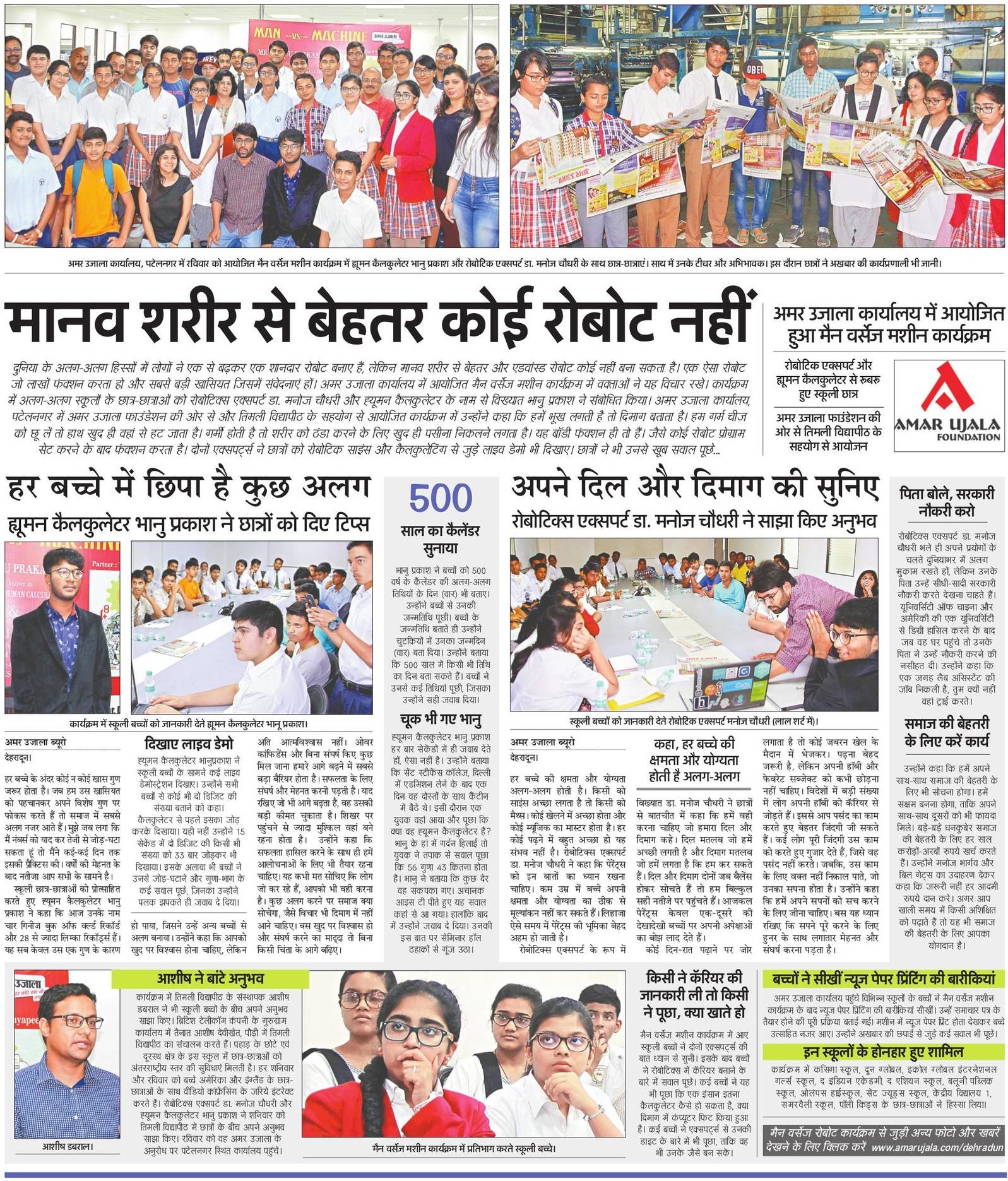 अमर उजाला फाउंडेशन और तिमली विद्यापीठ के संयुक्त तत्वावधान में दिनांक 30 जुलाई, 2017 को अमर उजाला, पटेलनगर, देहरादून कार्यालय में मैन वर्सेज मशीन कार्यक्रम का आयोजन किया गया. कार्यक्रम में डॉ. मनोज चौधरी (रोबोटिक एक्सपर्ट) और भानु प्रकाश (ह्युमन कैलकुलेटर) से रूबरू हुए स्कूली छात्र. इस दौरान बच्चों ने अख़बार प्रिंटिंग की कार्य प्रणाली... Read More