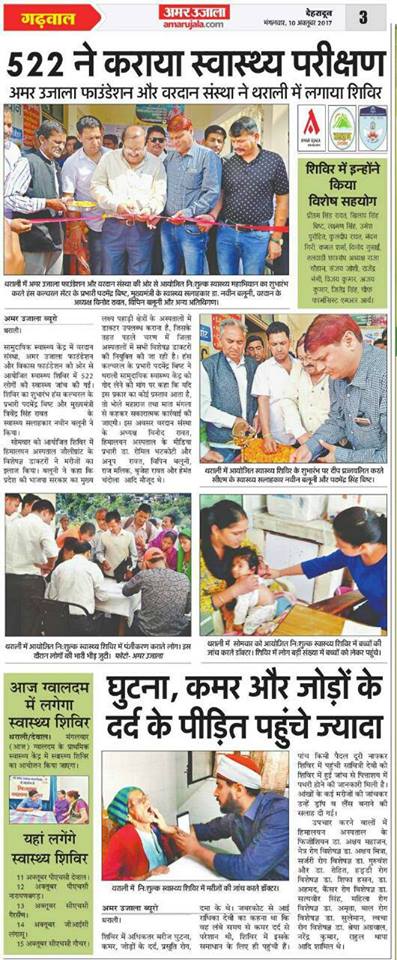 अमर उजाला फाउंडेशन और वरदान संस्था की ओर से आयोजित सात दिवसीय स्वास्थ्य महाभियान का शुभारंभ मुख्यमंत्री के स्वास्थ्य सलाहकार डा. नवीन बलूनी और हंस कल्चरल सेंटर के प्रभारी पदमेंद्र बिष्ट ने किया। पहले दिन हिमालयन अस्पताल जौलीग्रांट के चिकित्सकों ने 522 मरीजों के स्वास्थ्य की जांच कर मुफ्त दवाएं दी।