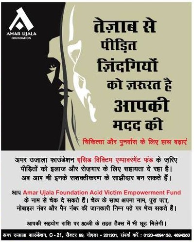 तेज़ाब से पीड़ित जिंदगियों को ज़रूरत है आपकी मदद की चिकित्सा और पुनर्वास के लिए बढ़ाएं हाथ AMAR UJALA FOUNDATION ACID VICTIM EMPOWERMENT FUND के नाम से चेक प्रदान कर आप भी इनके सशक्तिकरण के साझीदार बन सकते हैं. चेक के साथ अपना नाम, पूरा पता, मोबाइल नंबर और पैन नंबर की जानकारी अमर उजाला...