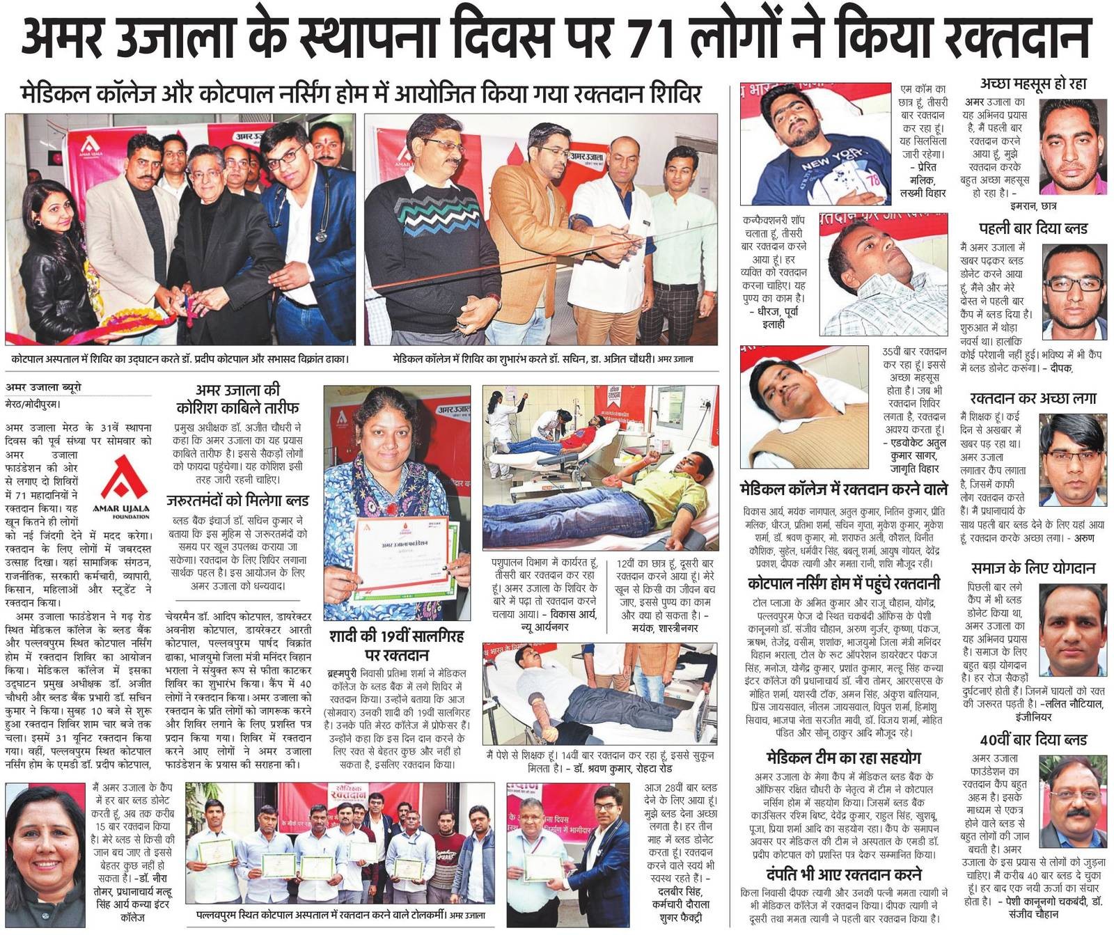 अमर उजाला फाउंडेशन द्वारा दिनांक 11 दिसम्बर, 2017 (सोमवार) को मेरठ में दो स्थानों (मेडिकल कॉलेज और कोटपाल नर्सिंग होम) में रक्तदान शिविर का आयोजन किया गया. शिविर में फाउंडेशन के प्रयाश की सराहना करते हुए 71 लोगों ने रक्तदान किया.