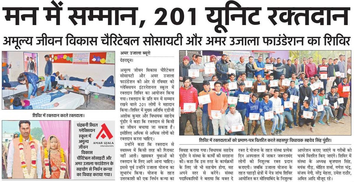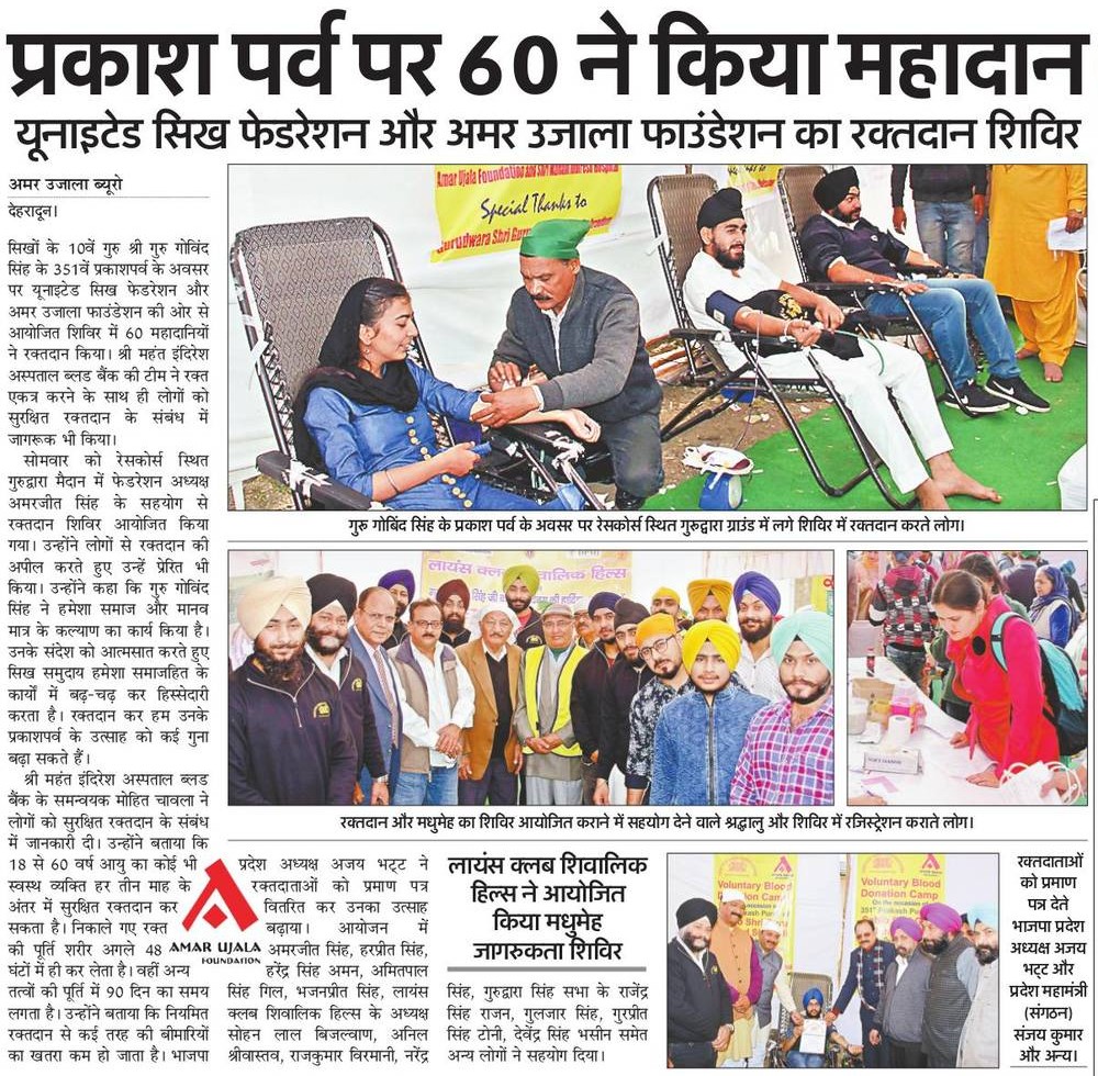 अमर उजाला फाउंडेशन और यूनाइटेड सिख फेडरेशन के संयुक्त तत्त्वावधान में श्री गुरु गोविन्द सिंह के 351वें प्रकाश पर्व के अवसर पर 25 दिसम्बर को रेसकोर्स स्थित गुरुद्वारा मैदान, देहरादून में आयोजित रक्तदान शिविर में 60 महादानियों ने रक्तदान किया.