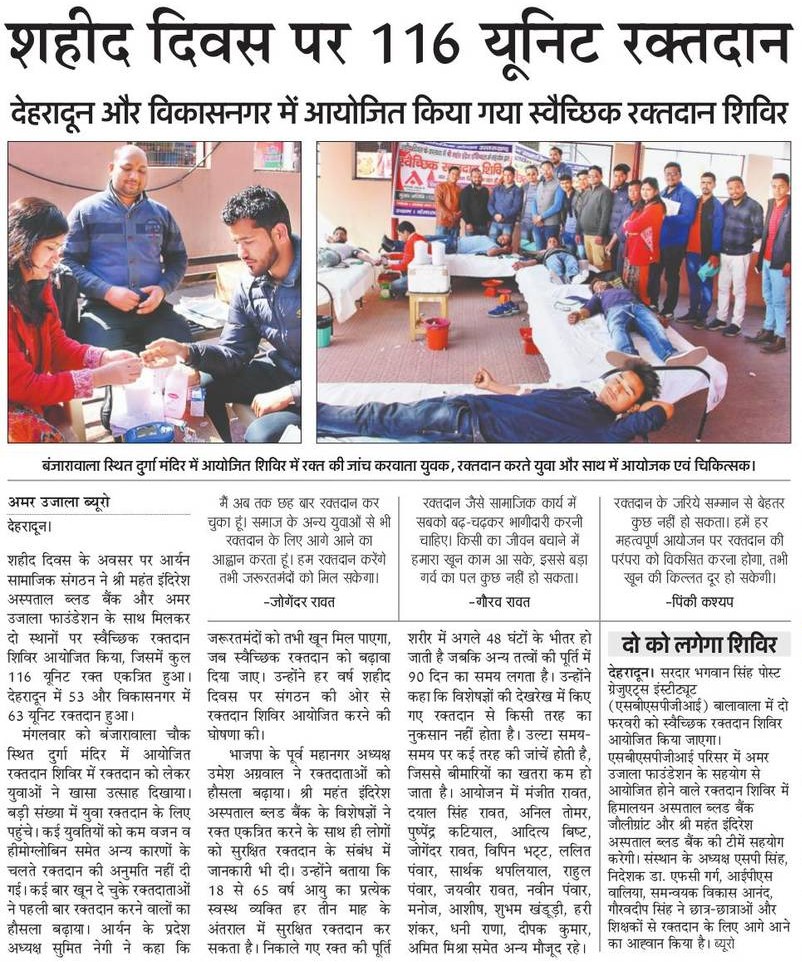 अमर उजाला फाउंडेशन और आर्यन सामाजिक संगठन के संयुक्त तत्वावधान में मंगलवार को शहीद दिवस के अवसर पर श्री महंत इन्दिरेश अस्पताल ब्लड बैंक के सहयोग से देहरादून में स्वैच्छिक रक्तदान शिविर का आयोजन किया गया. शिविर में 116 लोगों ने रक्तदान किया.