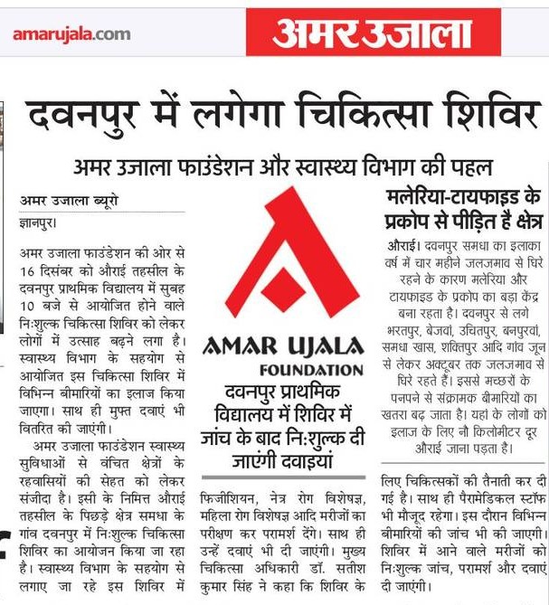 14 दिसम्बर, 17 (बृहस्पतिवार) को प्राथमिक विद्यालय, लाक्षागृह, हंडिया, इलाहाबाद में आयोजित स्वास्थ्य चिकित्सा शिविर में विभिन्न रोगों के विशेषज्ञों द्वारा 427 मरीजों का निःशुल्क स्वास्थ्य परीक्षण किया गया. शिविर का उद्घाटन करते हुए एसडीएम कुलदेव सिंह ने अमर उजाला फाउंडेशन के प्रयाश की सराहना की.