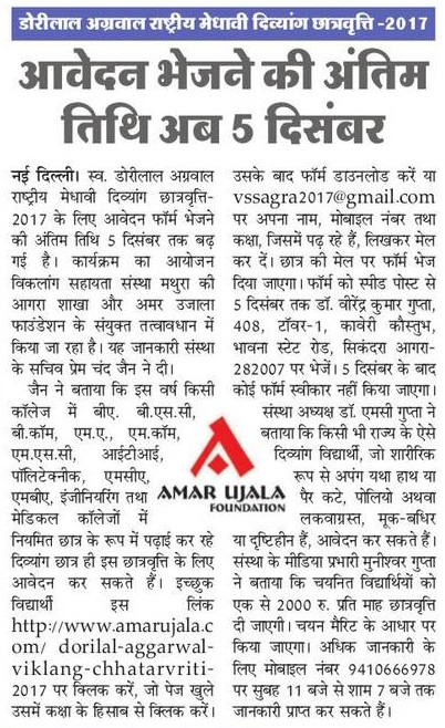 डोलीलाल अग्रवाल राष्ट्रीय मेधावी दिव्यांग छात्रवृत्ति -2017 के आवेदन फार्म भेजने की अंतिम तिथि बढ़ी