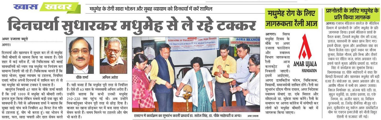 विश्व मधुमेह दिवस के अवसर पर अमर उजाला फाउंडेशन और स्वास्थ्य विभाग के संयुक्त तत्वावधान में जागरूकता रैली का आयोजन आज 45 शहरों में आयोजित किया जा रहा हैं. आगरा में यह रैली कलेक्ट्रेट से निकाली जाएगी. इसमें आईएमए, आगरा डायबीटीज फोरम, चिकित्सक-विद्यार्थी, समाजसेवी शामिल होंगे. रैली का शुभारंभ डी एम गौरव दयाल, अपर निदेशक... Read More