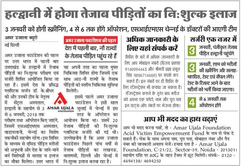 उत्तर भारत में पहली बार उत्तराखंड के हल्द्वानी में तेजाब पीड़ितों का निःशुल्क परीक्षण एवं सर्जरी शिविर आयोजित किया जा रहा है। अमर उजाला फाउंडेशन की पहल पर इस शिविर में देश के प्रसिद्ध प्लास्टिक सर्जन डॉ. के.श्रीधर की और उनकी टीम के नेतृत्व में सेंट्रल अस्पताल, हल्द्वानी के सहयोग से 3 से 6 जनवरी,... Read More