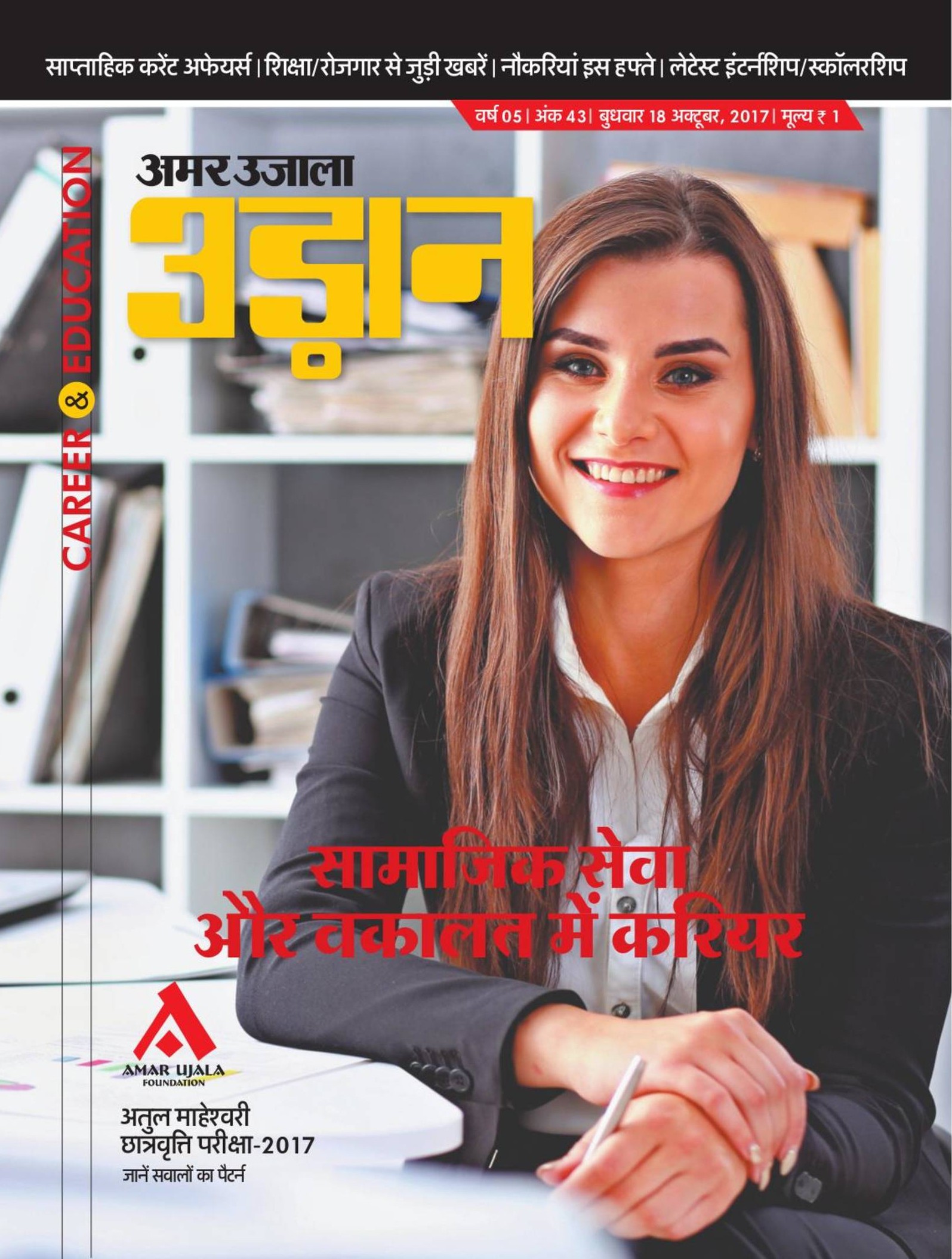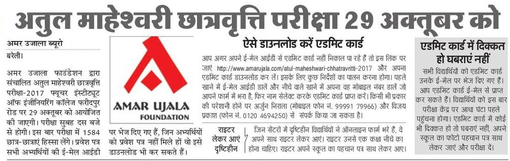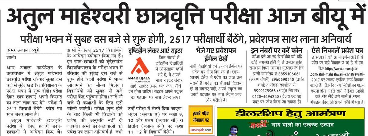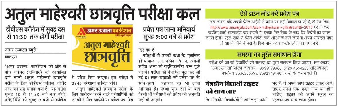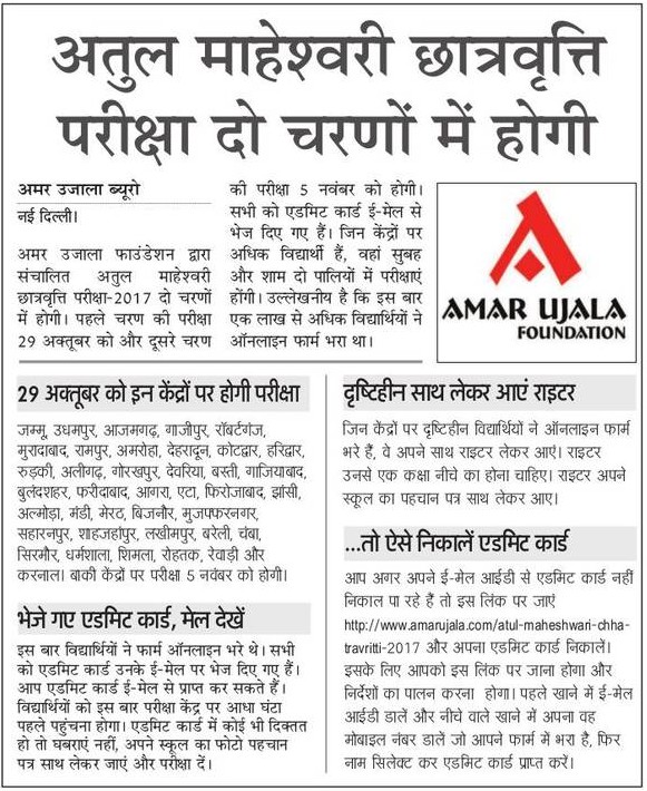 अमर उजाला फाउंडेशन द्वारा आयोजित अतुल माहेश्वरी छात्रवृत्ति परीक्षा- 2017 के दूसरे चरण की परीक्षा आज. परीक्षा 16 शहरों के 19 केन्द्रों पर होगी. विद्यार्थियों को प्रवेश पत्र के साथ स्कूल का परिचय पत्र साथ लाना होगा.