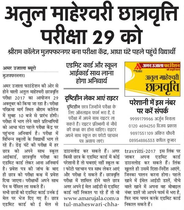 मुज़फ्फरनगर में अतुल माहेश्वरी छात्रवृत्ति परीक्षा 29 अक्टूबर को