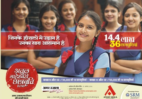 अतुल माहेश्वरी छात्रवृत्ति परीक्षा-2017 का काउंट-डाउन शुरू..   अमर उजाला फाउंडेशन द्वारा संचालित अतुल माहेश्वरी छात्रवृत्ति परीक्षा-2017 का काउंट-डाउन शुरू हो गया है. इस बार आवेदन केवल ऑनलाइन ही भरे जाएंगे. गत वर्ष एक लाख से अधिक प्रतिभाशाली विद्यार्थी अतुल माहेश्वरी छात्रवृत्ति के लिए हुई परीक्षा में शामिल हुए थे और उसमें सफल हुए 36... Read More