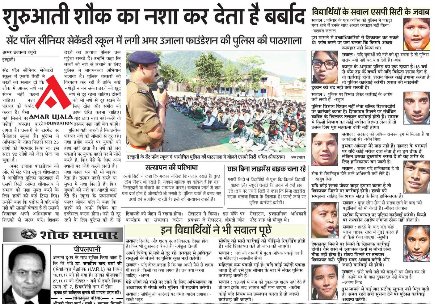 अमर उजाला फाउंडेशन द्वारा दिनांक 23 नवंबर, 2017 (गुरुवार) को हल्द्वानी के सेंट पॉल स्कूल में पुलिस की पाठशाला का आयोजन किया गया. पाठशाला में एसपी सिटी अमित श्रीवास्तव ने बच्चों का मार्गदर्शन किया और छात्रों को सलाह दी की शौक में आकर नशे का सेवन नहीं करना चाहिए. नशा परिवार को बर्बाद कर देता... Read More