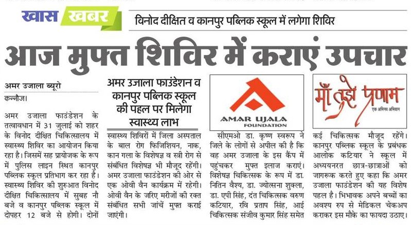 अमर उजाला फाउंडेशन के तत्वावधान में आज दिनांक 31 जुलाई, 2017 को कन्नौज के विनोद दीक्षित चिकित्सालय में एकदिवसीय निःशुल्क स्वास्थ्य शिविर का आयोजन किया जा रहा हैं, जिसमें सह प्रायोजक के रूप में पुलिस लाइन स्थित कानपुर पब्लिक स्कूल प्रतिभाग कर रहा है. शिविर का आयोजन प्रातः 9 बजे से अपराह्न 12 बजे तक... Read More