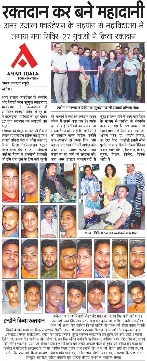 अमर उजाला फाउंडेशन द्वारा दिनांक 09 अक्टूबर, 2017 (सोमवार) को हेमवती नंदन बहुगुणा स्नातकोत्तर महाविद्यालय, खटीमा, नैनीताल में रक्तदान शिविर का आयोजन जिला चिकित्सालय रुद्रपुर स्थित ब्लड बैंक के डॉ. रामबिहारी वर्मा के नेतृत्व में किया गया. शिविर में 27 युवाओं ने रक्तदान किया. शिविर का उद्घाटन करते हुए प्राचार्य प्रणिता नंदा ने कहा कि... Read More