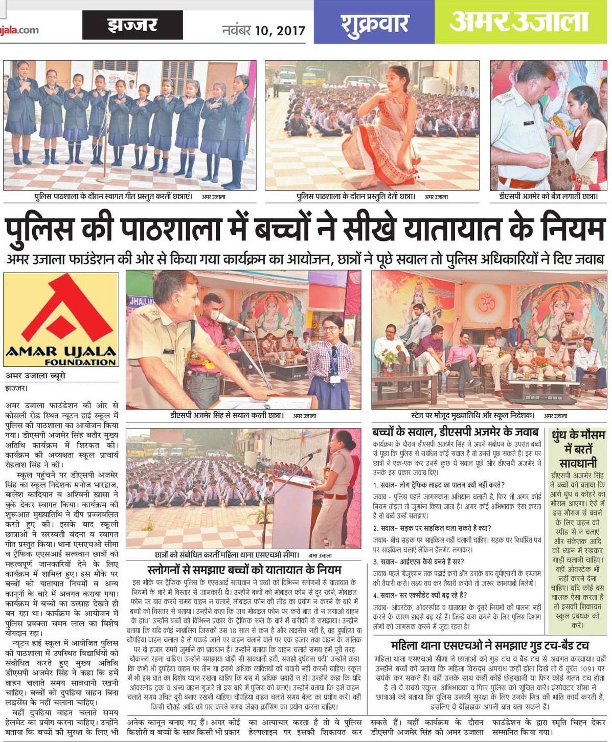 अमर उजाला फाउंडेशन की ओर से गुरूवार 09 नवम्बर, 2017 को न्यूटन हाई स्कूल, कोसली रोड, झज्जर में आयोजित पुलिस की पाठशाला को डीएसपी अजमेर सिंह ने संबोधित किया और कहा कि हमें वाहन चलाते समय सावधानी रखनी चाहिए. बच्चों को बिना लाइसेंस वाहन नहीं चलाना चाहिए. वहीँ दुपहिया वाहन चलाते समय हेलमेट का प्रयोग... Read More
