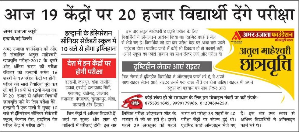 अमर उजाला फाउंडेशन द्वारा आयोजित अतुल माहेश्वरी छात्रवृत्ति परीक्षा- 2017 के दूसरे चरण की परीक्षा आज. परीक्षा 16 शहरों के 19 केन्द्रों पर होगी. विद्यार्थियों को प्रवेश पत्र के साथ स्कूल का परिचय पत्र साथ लाना होगा.