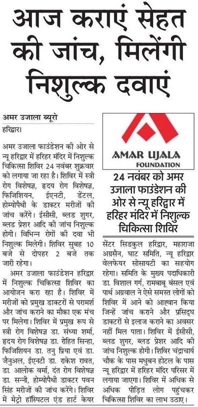 अमर उजाला फाउंडेशन द्वारा न्यू हरिद्वार के हरिहर मंदिर में आज दिनांक 24 नवम्बर, 2017 (शुक्रवार) को निःशुल्क स्वास्थ्य चिकित्सा शिविर का आयोजन किया जा रहा हैं. शिविर में मरीजों की निःशुल्क जांच की जा रही हैं और दवाईयां भी प्रदान की जा रही हैं.