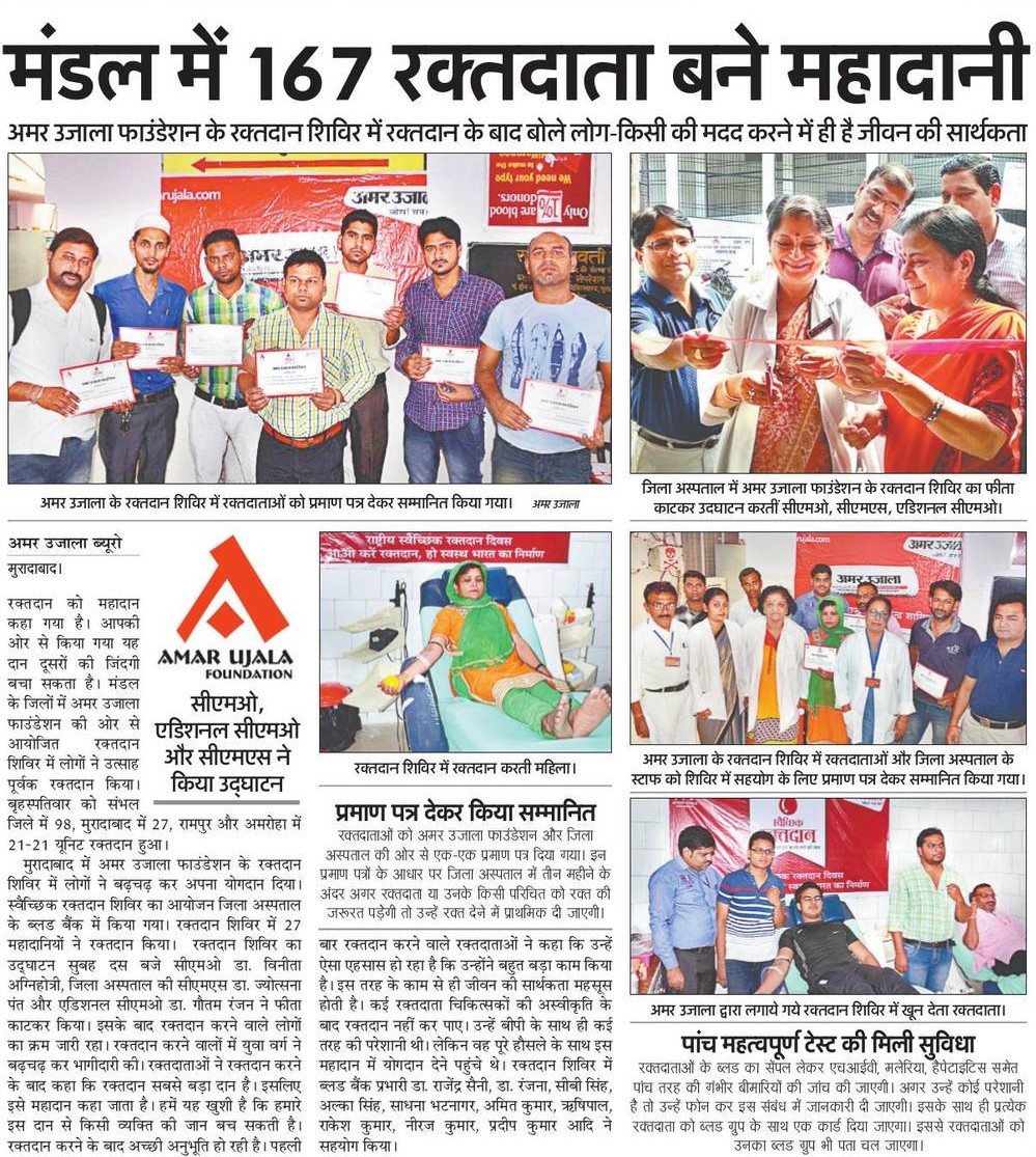 दिनांक 15 सितम्बर, 2017 (शुक्रवार) को अमर उजाला फाउंडेशन और विभिन्न संगठनों के संयुक्त तत्वावधान में कानपुर में तीन विभिन्न स्थानों पर आयोजित स्वैच्छिक रक्तदान शिविर में 86 यूनिट रक्तदान हुआ.