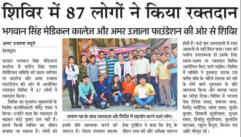 अमर उजाला फाउंडेशन और संदीप सिंह रावत मेमोरियल समिति के संयुक्त तत्वावधान में दिनांक 29 अक्टूबर, 2017 (रविवार) को सरदार भगवान सिंह मेडिकल कॉलेज में रक्तदान शिविर का आयोजन किया गया. शिविर में 87 लोगों ने रक्तदान किया. शिविर का उद्घाटन करते हुए मुख्यमंत्री के विशेष कार्याधिकारी धीरेन्द्र पंवार ने कहा कि रक्तदान से बढ़कर... Read More