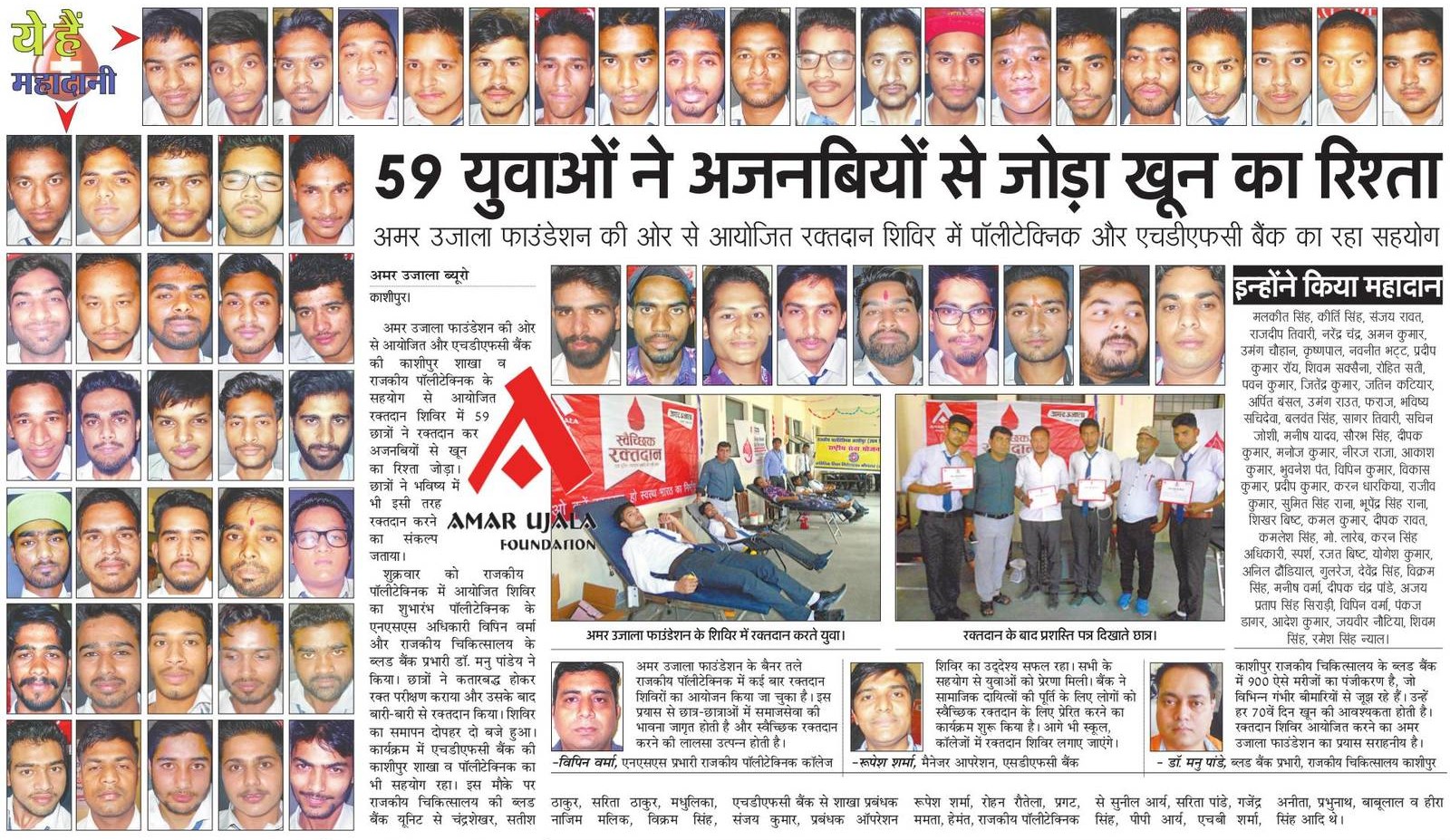 अमर उजाला फाउंडेशन की ओर से दिनांक 13 अक्टूबर, 2017 (शुक्रवार) को रक्तदान शिविर का आयोजन किया गया, जिसमें एच.डी.एफ.सी. बैंक, काशीपुर शाखा व राजकीय पोलिटेक्निक, काशीपुर ने सहयोग प्रदान किया. शिविर प्रातः 10 बजे से अपराह्न 2 बजे तक राजकीय पोलिटेक्निक में आयोजित किया गया. रक्तदान शिविर में कुल 59 छात्रों ने रक्तदान कर अजनबियों... Read More
