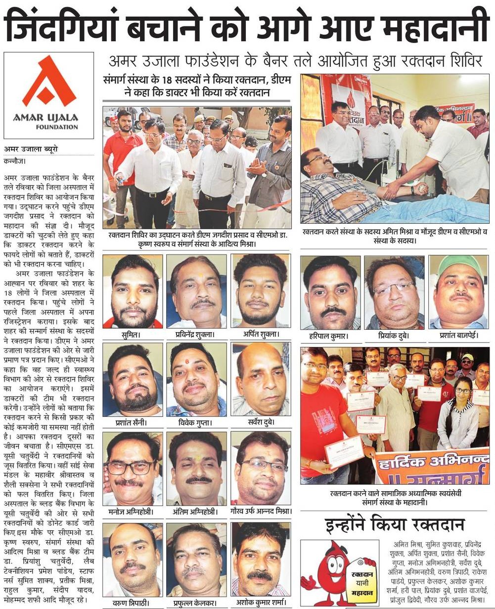 अमर उजाला फाउंडेशन द्वारा दिनांक 5 नवंबर, 2017 (रविवार) को जिला अस्पताल, कन्नौज में रक्तदान शिविर का आयोजन किया गया. शिविर का उद्घाटन करते हुए डीएम जगदीश प्रसाद ने रक्तदान को महादान की संज्ञा दी. शिविर में सन्मार्ग संस्था के 18 सदस्यों ने रक्तदान किया.