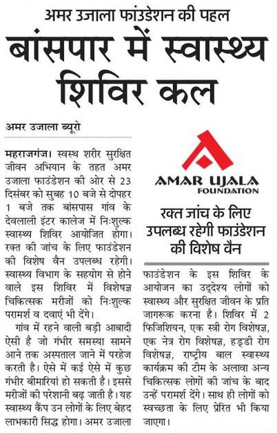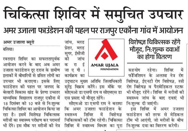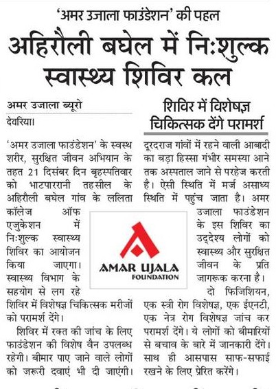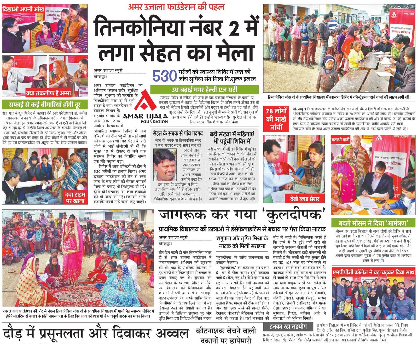 अमर उजाला फाउंडेशन द्वारा दिनांक 20 दिसम्बर, 2017 को गोरखपुर के चरगांव, तिकोनिया नंबर दो स्थित उच्च प्राथमिक विद्यालय में आयोजित निःशुल्क स्वास्थ्य चिकित्सा शिविर में 530 मरीजों का निःशुल्क परीक्षण किया गया.