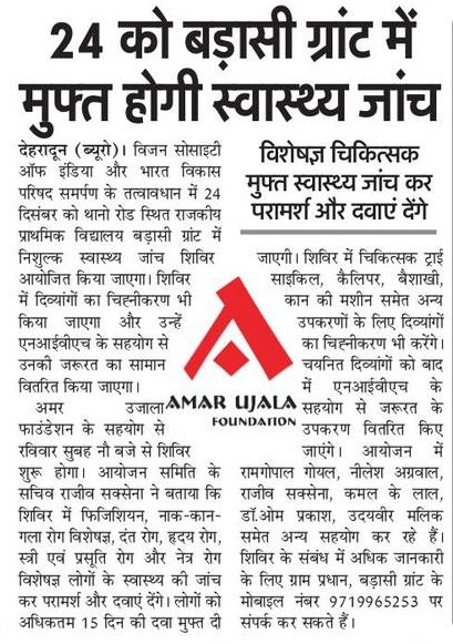 अमर उजाला फाउंडेशन के सहयोग से विजन सोसाइटी ऑफ़ इंडिया और भारत विकास परिषद समर्पण के संयुक्त तत्वावधान में 24 दिसम्बर को राजकीय प्राथमिक विद्यालय, बड़ासी ग्रांट, थानों रोड, देहरादून में निःशुल्क स्वास्थ्य शिविर का आयोजन प्रातः 9 बजे से किया जाएगा. शिविर में दिव्यांगों का चिन्हीकरण भी किया जाएगा और उन्हें एनआईवीएच के सहयोग... Read More