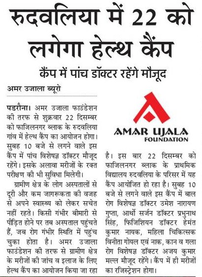 अमर उजाला फाउंडेशन द्वारा दिनांक 20 दिसम्बर, 2017 को गोरखपुर के चरगांव, तिकोनिया नंबर दो स्थित उच्च प्राथमिक विद्यालय में आयोजित निःशुल्क स्वास्थ्य चिकित्सा शिविर में 530 मरीजों का निःशुल्क परीक्षण किया गया.