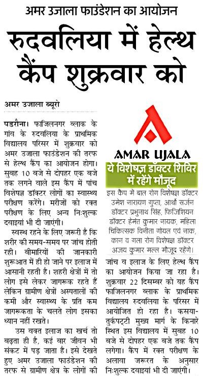 अमर उजाला फाउंडेशन द्वारा आज दिनांक 22 दिसम्बर को कुशीनगर, फाजिलनगर ब्लाक के रुदवलिया के प्राथमिक विद्यालय परिसर में एकदिवसीय निःशुल्क स्वास्थ्य चिकित्सा शिविर का आयोजन किया जा रहा हैं.