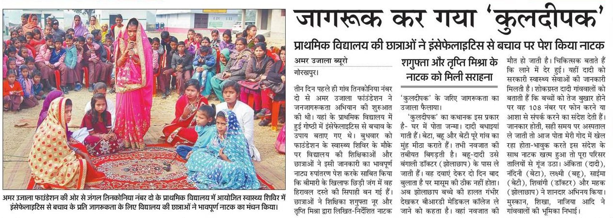 अमर उजाला फाउंडेशन द्वारा इंसेफेलाइटिस से बचाव के लिए रविवार से गोरखपुर के गांव तिनकोनिया नंबर दो से जनजागरूकता अभियान की शुरुआत प्राथमिक विद्यालय में गोष्ठी के माध्यम से की गई थी. इसी क्रम में बुधवार 20 दिसम्बर को विद्यालय की शिक्षिकाओं और छात्राओं द्वारा नाटक का मंचन किया गया.