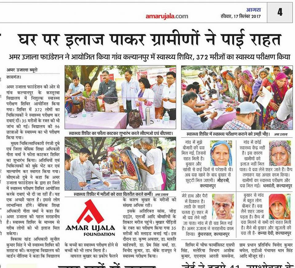 अमर उजाला फाउंडेशन द्वारा कल्यानपुर गांव, कासगंज के कस्तूरबा गांधी आवासीय बालिका विद्यालय, आगरा में दिनांक 16 सितम्बर, 2017 (शनिवार) को एकदिवसीय निःशुल्क चिकित्सा स्वास्थ्य शिविर का आयोजन किया गया. जिसमें 372 मरीजों का निःशुल्क स्वास्थ्य परीक्षण किया गया. घर पर इलाज़ पाकर ग्रामीणों ने पाई राहत..