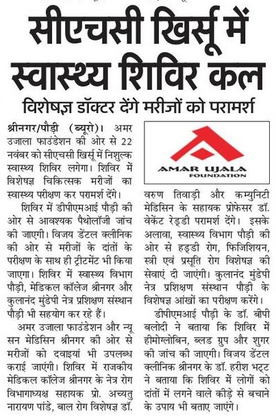 अमर उजाला फाउंडेशन द्वारा आज दिनांक 18 नवम्बर, 2017 (शनिवार) को देवबंद सीएचसी, सहारनपुर में एकदिवसीय निःशुल्क स्वास्थ्य चिकित्सा शिविर का आयोजन किया जा रहा हैं. शिविर में मरीजों को निःशुल्क दवाइयों के साथ-साथ चिकित्सक के परामर्शानुसार रक्त की जांच भी निःशुल्क की जाएगी.