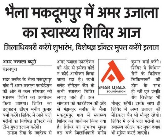 अमर उजाला फाउंडेशन की ओर से आज दिनांक 11 दिसम्बर, 2017 (सोमवार) को मंझनपुर सदर ब्लॉक के भैला मकदूमपुर गाँव में निःशुल्क स्वास्थ्य चिकित्सा शिविर का आयोजन किया जा रहा हैं. शिविर में आने वाले मरीजों का निःशुल्क स्वास्थ्य परीक्षण कर मुफ्त दवाईयां प्रदान की जाएंगी.
