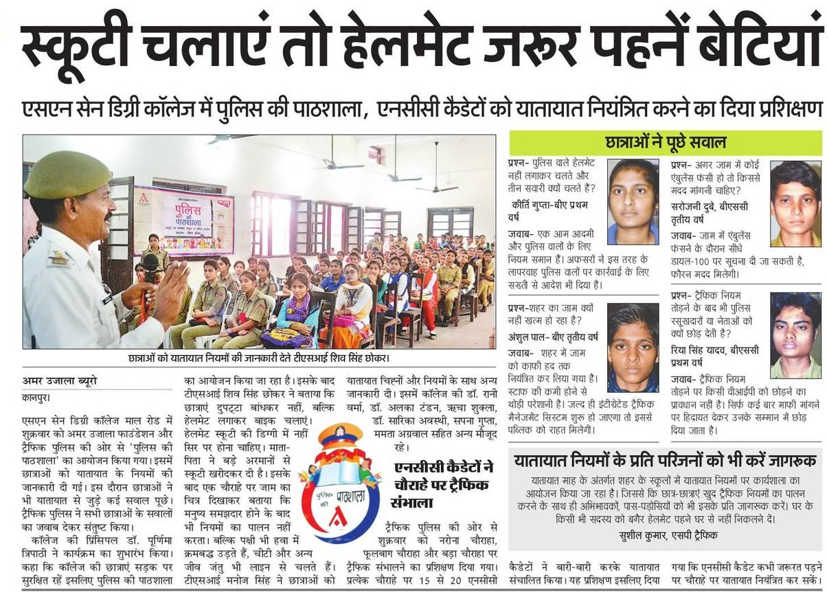 अमर उजाला फाउंडेशन की और से 17 नवम्बर, 2017 (शुक्रवार) को एस.एन. सेन इंटर कॉलेज, मॉल रोड, कानपुर में पुलिस की पाठशाला का आयोजन किया गया. एसपी ट्रैफिक सुशील कुमार ने यातायात के प्रति जागरुक करते हुए कहा कि घर के किसी भी सदस्य को बाइक पर बिना हेलमेट पहने घर से नहीं निकलने दें.... Read More