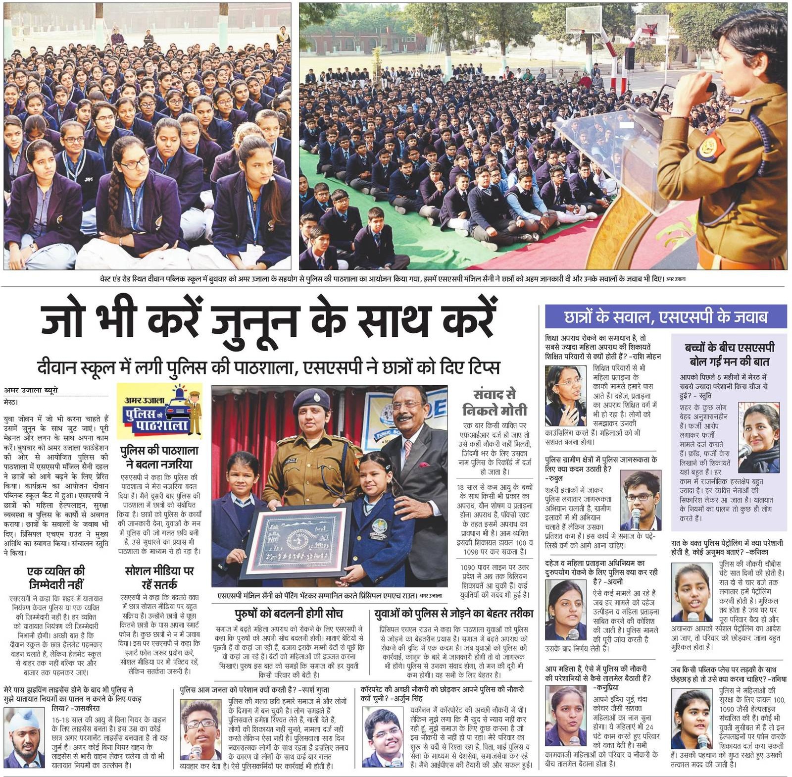अमर उजाला फाउंडेशन की ओर से बुधवार, 6 दिसम्बर, 2017 को दीवान पब्लिक स्कूल, मेरठ में पुलिस की पाठशाला का आयोजन किया गया. पाठशाला को सबोधित करते हुए एसएसपी मंजिल सैनी ने छात्रों को आगे बढ़ने के लिए प्रेरित किया और कहा कि पाठशाला के माध्यम से युवाओं में पुलिस की जो गलत छवि बनी... Read More